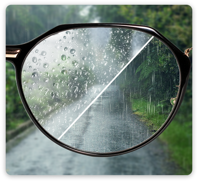 Hydrophobic lenses also have a special coating on them that is designed to protect the lenses from moisture and water droplets. Whenever there are rains or heavy snowfall they slide off beautifully from the surface of the lens as the stiffness between the liquid and the hydrophobic lens exterior is lower. This help the water droplets fall off the glass surface without leaving any residual moisture behind. Hydrophobic coating also keeps dust and dirt particles away.